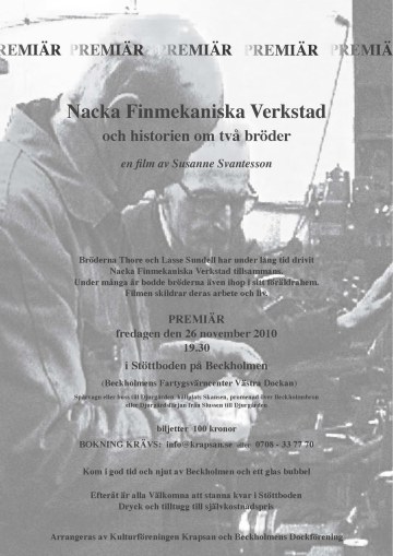 Nacka Finmekaniska Verkstad och historien om två bröder arrangeras av Kulturföreningen Krapsan och Beckholmens Dockförening. Gå gärna in på Beckholmens Fartygsvärncenters hemsida som vi har länkat via vår sida och läs mer www.beckholmen.blogspot.com/ .