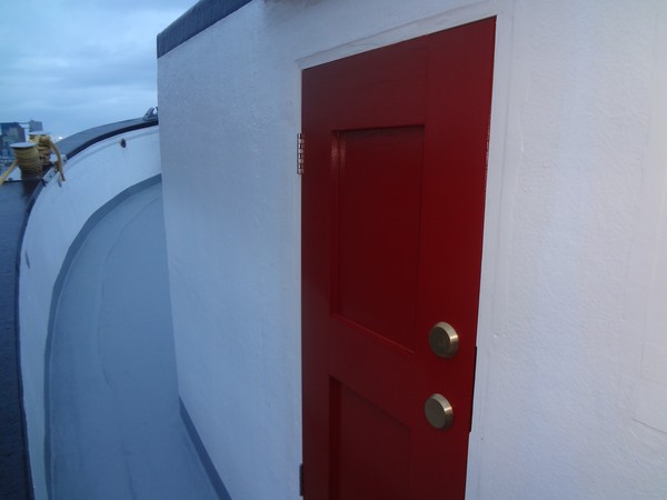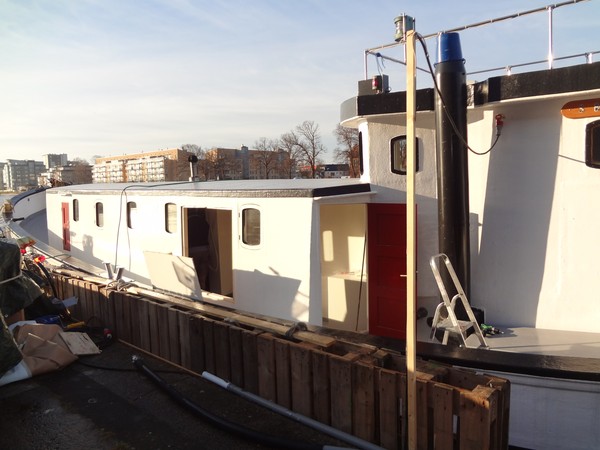 Och nu är hålet reparerat med ny plywoodbit och nya skruvar (som vi satt rätt även denna gång) och så har vi plastat på nytt. Nu är vi ikapp inom någon halv vecka med grundfärg, färg och flingor och då kan vi lacka även golvet.