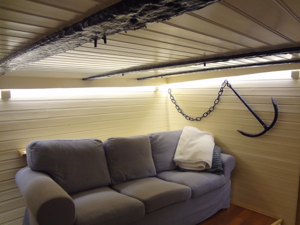 Ingången till främre hytten ombord. Och av alla seriösa namn vi funderat på genom åren, om vad vi ska kalla de olika hytterna. Så föll det sig rätt så naturligt tillslut. Och varför vara så seriös..nä, kan vi få någon att dra på munnen för våra namnval så är allt vunnet. Livet är liksom för kort för att ha tråkigt. Eller som en känd svensk komiker sa; -man lever så kort tid och man är död så länge! Ja då gäller det att liva upp lite.