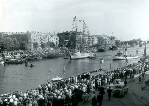 Skolskeppet Najaden kommer till Halmstad 1946. Det ska dröja ytterligar tio år innan man bygger slottsbron. Intresset var enormt och människor packade sig längs med kajkanterna för att vara med i festligheterna. Nu väntar dystert öde för skolskeppet som kommunen bestämt sig för att avyttra. Bristande kunskap och intresse hos styrande som inte förstått vikten av skötsel och underhåll har bidragit till den tråkiga utvecklingen av fartyget. Det hela är rätt sorgligt, en kommun är nog inte lämpad att äga en sådan här skatt. Iallafall inte Halmstad.