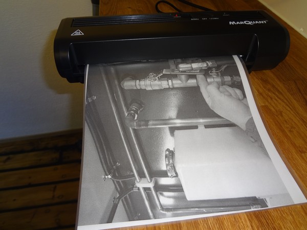 Helena laminerar alla bilderna. Det kommer ta sin tid innan allt är på plats men målet är att ha båtens servicebok klar till sommaren.