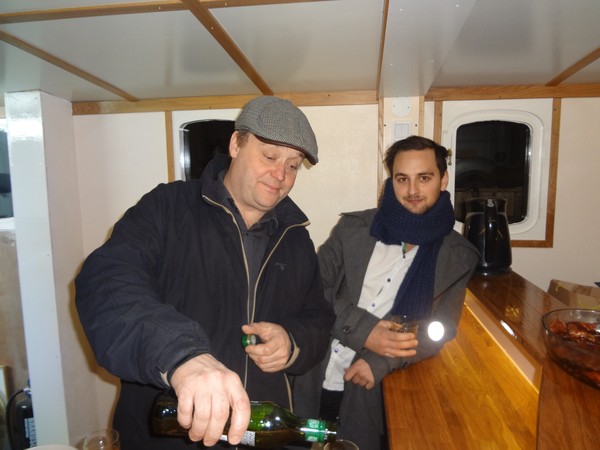 Av någon anledning så valde karlarna att stå på insidan av baren medan Helena fick hålla till på utsidan. Med mysigt mingelsnack till ljudet av Frank Cinatra och med grillen sprakande på kajen så stod vi och snackade och smuttade. Därefter väntade det en god grillad köttbit med chevreosttäcke och en varm sallad. Ett gott glas rött innan det blev tv framför den sprakande brasan. Sonen gav oss godkänt..allt från pruttare till kaminvärmen. Kanske att han också vill ha en båt i framtiden, hur som helst har han börjat titta på båtannonser..