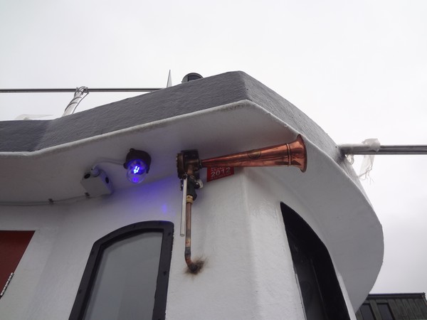 Ombord så har vi haft trevliga byggardagar. Det händer lite både här och där och här kommer litet axplock. Tjoppe har putsat tutan, monterat den och en kompressor i motorrummet. Nu har vi test-tutat. Man lättar snyggt ett par decimeter från däcket om man står nära. Så nog ska vi höras ute på havet om dimman slår till.