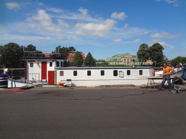 På agendan den senaste tiden så står ankarspelet. Vi har arbetat med det peke som ska hålla ankaret på plats när det inte används till att hålla fast båten vid botten. Vi har hoppat upp och ner på flotten ett otal gånger och till slut, långt efter att alla i detta land ätit sin kvällsmiddag så var vi klara och kunde hoppa ur arbetskläderna och ge oss lite vila och mat. Ja klara med peket alltså, för vi har ju resten kvar. Men nu börjar det dra ihop sig, snart har vi ankaret på plats som en bättre gallionsfigur i stävern. Tjoppe frågade för övrigt Helena när vi höll på: -Tror du båtar har en själ? Helena blev lite svävande på svaret. Tjoppe fortsatte -Om det är så, så tror jag vårt fartyg känner sig lite stolt och stöddig med peket längst fram. Jo kan så vara, självklart så är vårt fartyg stolt. Här satsar någon på henne, tror på henne och klär henne med saker som får henne att känna sig välutrustad och stark. Till skillnad från Najaden, där hon ligger oönskad och osäker inför vilket öde som väntar henne, värdelös och i centrum för en het debatt kring hennes existens.
