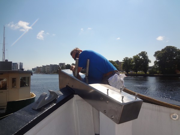 Till det faktum att vi också arbetar med att renovera, där människor kan komma förbi och titta, utgör ett visst kulturarv. Vi håller till där det är öppet för alla att promenera och se lite av vad båtbyggarlivet innebär. Förr så arbetades det ständigt på alla fartyg och båtar. Men underhållet har minskat i takt med nyare material och att man idag står inne i båthus, eller andra inhägnade områden där inte allmänheten har tillträde. Framför allt barn som passerar med sina föräldrar på promenader visar ett stort och spännande engagemang inför vad vi sysslar med. Och på bilden ovan så hänger en farbror i fören på båten.