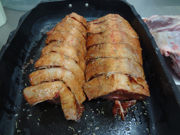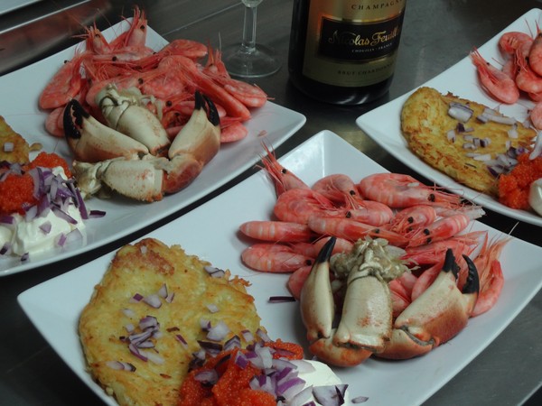 Skaldjur till förrätt och till varmrätt två härliga lammkotlettsrader som kryddats med rosmarin och vitlök och annat gott.