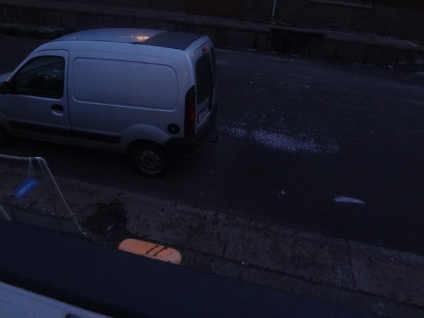 En bild på bilen tagen från däck ombord. Vi har flyttat upp till andra våningen och det skulle kunna krävas stege om vi inte var så flinka och tog hjälp av vår pollare, stormskydd och spygatt för att ta och upp och ner.