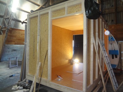 Kvaliteten på fotot kan ifrågasättas, kameran låg kvar hemma nyladdad och allt. Golv och tak och reglar är ungefär det som finns idag. Vi fick besök av en man. Ja vi har lite lösa bekantskaper som är nyfikna och som inte bara följer oss blogg-ledes utan även kommer förbi på cykel eller något annan fortskaffningsfordon, för att beskåda nästa steg. Nu kom ”cykel-mannen” förbi häromdagen. En mycket trevlig man som nyfiket följer oss och som är en rätt klok man. Han tittade länge på sjöbodarna och så säger han till Tjoppe; -Ska du inte ha några dörrar. Tjoppe tittar förvånat upp och svarar -Dörrar, oj det har jag glömt! Det går någon sekund och sedan spricker Tjoppe upp i ett leende och cykel-mannen förstår att Tjoppe visst har planerat dörrar. Fast man inte ser vart för tillfället.