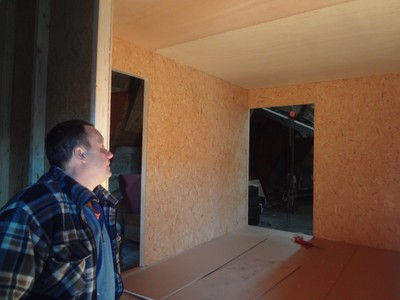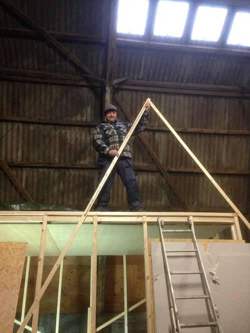 Vi hjälptes åt med de stora takskivorna, Helena fick slita sig från skrivbordsarbetet för en stund. Det känns alltid kul att arbeta tillsammans sida vid sida. Och därefter diskuterade vi takstolar.