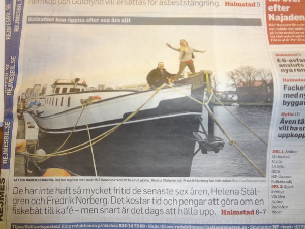 Vår båt vilar i kvällsolen. Tänk att vårt flytetyg fick ett sådant vackert utseende, räddad från det vrak det en gång var. Fylld för en funktion och till glädje för många, inte minst oss själva. Med tiden kommer vi fortsätta utveckla henne, räcke och mast och mer navigationsutrustning med mera. Vi har varit rätt flitiga. Klapp klapp klapp (det var ljudet från våra klappar på våra egna axlar).