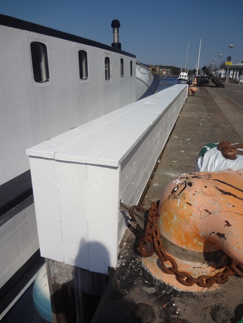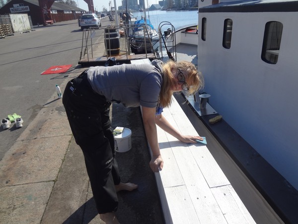 Tvättning av ljugarbänken, eller stormskyddet som det egentligen är. Såg rätt vitt ut utan färg men vi drog två lager vitt så det blev skinande rent och snyggt.