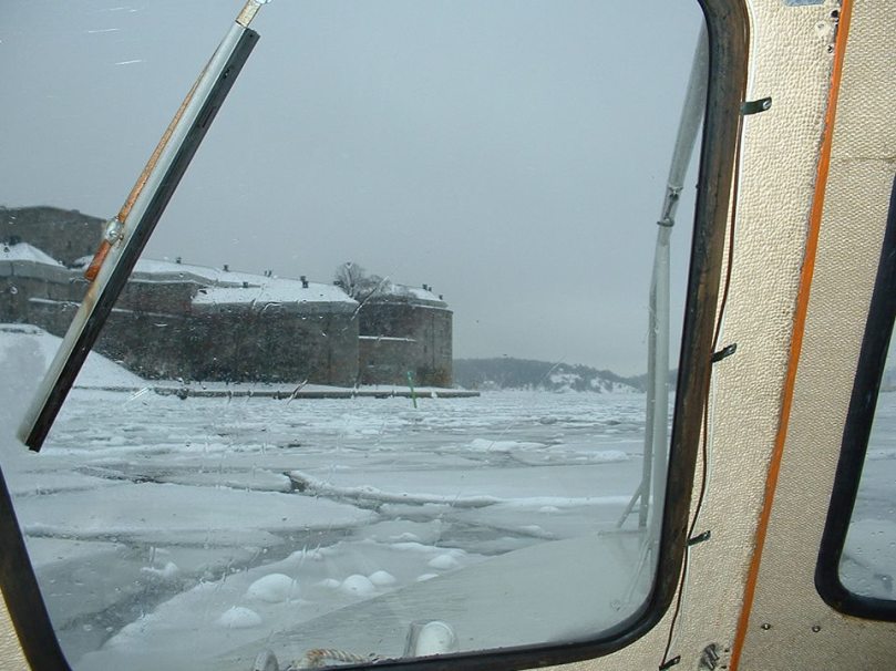 När vi växte upp och så även idag så måste ju alla barn ta sig till skolan. Visst hände det ett par gånger att vädret hindrade, men oftast inte. På vintern kunde det se ut som på bilden ovan. Där syns kastellet och på styrbordssida om båten så låg själva hjärtat i form av Vaxholms stad. På babords sida så tog man vägen till Tjoppes ö Stegesund. Och stävade man rakt fram och gick runt kastellet så kom man till Helenas ö. Rakt fram fanns Tynningö och Ramsö med flera öar.
