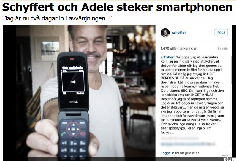 Tjoppe kunde ringa på sin mobiltelefon efter det att vi gjort om våra abonnemang till kontantkort. Och att ringa och messa kostar just inget. Men att ha internet på mobilen med kontantkort gräver fort hål på kronorna. Så när vi inte är hemma så har vi inget bärbart internet med oss. Behöver vi komma åt det så kan vi göra ett aktivt val och koppla upp oss. Men det funkar bra att bara ringa och messa. Det är skönt att släppa lite av beroendet som man har av mobilen och internetet också. Och tydligen så går det en våg av denna insikt, inte minst hos kändisar som är några av våra trendsättare.