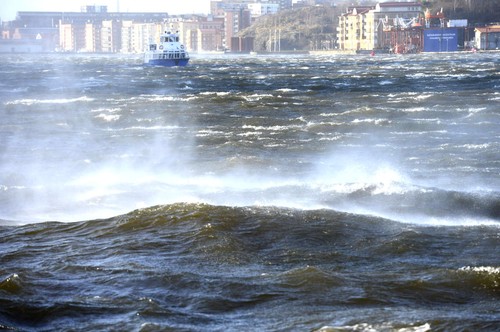 Framåt tio tiden och timmarna därefter så började vattnet släppa från vågtopparna. Som ett flygande skum och vattenrök så fylldes luften av saltvatten. Bil- och båtrutorna blev alldeles kladdiga av saltvattnet. Framåt lunch så upplystes det på radion om att flertalet broar och båtturer blivit inställda. På Tjörnbron hade man uppmätt 44 meter per sekund. Själva valde vi att hålla till i verkstan för ombordn gungade allt rejält, vilket fick oss att känna oss som små popcorn. Vid denna tidpunkt så blåste det 38 meter per sekund. Wilma klarar oväder mycket gott, svårare blev det att ta sig fram på landbacken då det i vindbyarna blev omöjligt att gå utan att vinden tog tag i en. De uppmanar människor att inte vara utomhus.