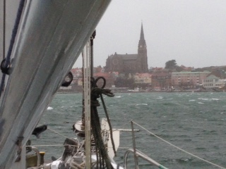 Vid halv åtta vaknade vi på nytt och då hade det börjat bralla i rejält. Vi la på lite fler förtöjningar och fixade lite frukost. Vi hade vid detta laget över trettio meter per sekund rakt in i stävern och Wilma försökte segla på masten. Det gick gäss på vågorna och Wilma gungade friskt.