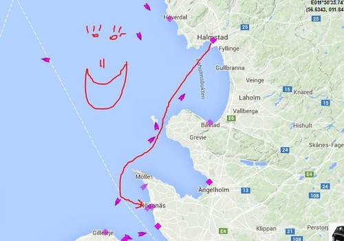 Men som det är med segling så är det naturen som bestämmer mycket, särskilt tidpunkten för ankomst. När vi rundade Kullen, ni vet den där tarmen som sticker ut som en förlängning på Hallandsåsen, som ett litet Kap Horn. Ja där runt hörnet möts vågor, vind och ström på något mystiskt sätt. Vågorna krockade med varandra så Wilma fick det lite gropigt det var under ett tag ingen ordning alls på naturlagarna. De stackars fåglar som försökte flyga for lite som vantar i luften, de flaxade och flaxade men kom ingenstans. Som i serietecknad film ni vet, rätt komiskt syn. Det var mycket få segelbåtar ute och de flesta hade betydligt mindre segel uppe än vi. Någon seglade utan storseglet uppe utan bara med ett försegel, någon hade revat storseglet. Vi hade alla segel uppe och nog har vi väl aldrig seglat om några aldrig båtar förr, men nu gick det som en dans.