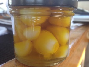 Vid en vägkorsning så hittade vi en butik i form av ett obemannat skjul. Där såldes rapsolja, marinerade vitlökar och såpa gjort på raps. Betalningen togs emot antingen med Swish eller så lämnade man sin kontanta betalning i en burk. Enkelt och i full förtroende för människors vilja att göra rätt för sig. Vi köpte en burk med marinerade vitlökar där även lökarna vuxit på ön.