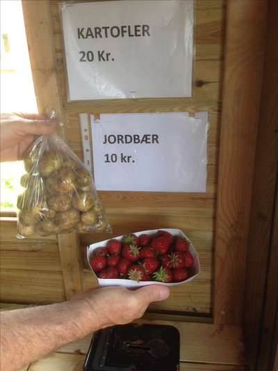 I Spodsbjerg gillar invånarna att sälja lite grödor från sina trädgårdar. Från ett litet skjul eller en träbänk utanför tomten så ställer de ut vad de har att erbjuda med en lapp om pris och därtill ett litet kassaskrin. På eget ansvar får man sedan shoppa loss och lämna sin peng. Huruvida de danska myndigheterna ser på kravet på en elektronisk kassaapparat vet vi inte, men överlag så verkar dansken mer avslappnad och mindre byråkratisk.