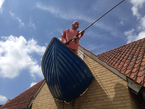 Med tanke på att Tjoppe inte fått en enda fisk sen vi lämnade Lysekil, bortsett från den där blåa stenbiten, så kanske detta är helt fel plats att åka till. Eller så är det tvärt om, det kanske kommer att bringa fiskelycka till Kapten. Här i hamnen finns det enormt många små sportfiskebåtar, som även går att hyra. Och överallt möter vi människor i rätta sportfiskekläder där de klafsar runt i stora stövlar. Till och med så håller hamnen med ett rensningsrum där det är rostfria bänkar och bra spolningsmöjligheter där man kan filéea sina firrar efter största behag.