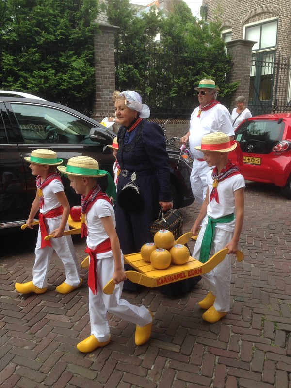 Vi kom lagom till detta ostspektakel skulle börja. En folkfest där vi först tågade med i en parad där de i täten bar på ostar, klädda i någon form av gammal folkdräkt och med en orkester som spelade. Och när vår vandring var över så bjöds vi på ett skådespel där man visade hur det gick till på marknaden förr i tiden. Edam var knökfull med åskådare och det var ditresta turister från hela europa till synes. Att ost kan locka så mycket människor hade vi ingen aning om.