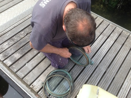 Vi valde att lägga till före en sluss framåt kvällen. Det fanns en gästhamn med plats men vi hade fått lite smak av att kunna hänga upp oss mitt i klorofyllen längs med kanalen. Denna natt låg vi helt ensamma, den enda platsen var ledig och den knep vi. Vi gick en lång kvällspromenad i den stekheta luften, det väntade en tropisk natt. Och väl tillbaka så somnade vi, och slogs lite mot mygg och knott som letat sig in i båten. Vi hade kor på ena sidan av kanalen och vassrugge och skog på den andra sidan. Sen vaknade vi på morgonen av en strålande sol. Vi hörde ett ljud som lät ”plopp”, ”plopp”, ”plopp”. En ung kille satt och metade tre meter från Wilma. Trevlig grabb fast med dålig fiskelycka, så en potentiell polare till kapten som även han saknar nappförmåga.