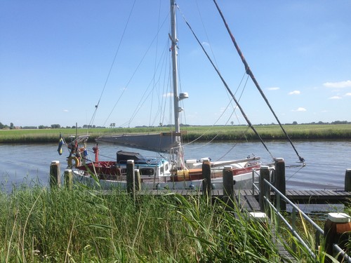 Vi sa hejdå och lycka till och lämnade vår nattplats. Vi tog slussen och därefter gled vi fram genom rågåkrar och hagar och passerade ett par broar och så slog vi oss ner längs med sidan igen. En iordningställd plats med bra förtöjningsmöjlighet, strax före Dokkum. Som sagt, kostar inget och man får ligga i upp till tre dygn. I en sommaroas där kanalen är rätt smal och båtarna passerar bara ett par meter utanför hyttfönstret.