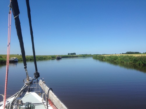 Till slut var vi igenom, det tog cirka två timmar att gå genom Groningen och vi passerade uppskattningsvis femtontalet broar. Och vid varje bro vi kom fram till så uppmärksammades vi med ett röd-grönt ljus och inom kort så lyfte de bron, och vi fick grönt. Vi hehövde inte alls hänga upp oss längs med sidan i väntan. Vi behövde aldrig ropa på VHF;en att vi önskade en broöppning. Av vår konvoj blev det till slut inte mycket kvar, en del stannade längs vägen, andra vek av in på annan kanal. Till slut var det bara vi och en båt till som tog samma väg. Vi gled långsamt fram på den slingrande vattenvägen och snart var vi ute ur staden och vi hade bara natur runtomkring. Kor, hästar, får och fåglar. Fält och hagar och ibland någon bondgård eller några hus.