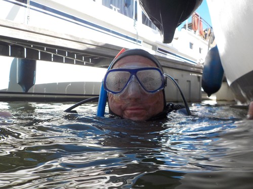 Vi skrattade gott alla fyra. Därefter höll vi upp Wilmas allra första propeller som vi hittat nedstuvad ombord, ännu lite mindre men i skick som ny. Med en ny propeller så behövde vi ju knappast två i reserv. Vi frågade;