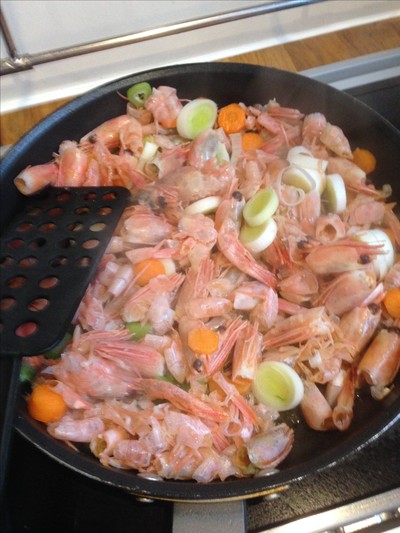 Snacket flöt på och snart var det dags för huvudrätt och det blev inte sämre det. För fiskgrytan var ju kokad på hemmagjord fond. Och till grytan så klickade vi på aioli som vi smaksatt med gurkmeja och rivet limeskal. Till det ett passande vitt vin. ”Hmmm-andet” fortsatte. Varenda skål och kastrull och tallrik skrapades. Bästa betyget en kock kan få, tomma tallrikar. Och grytan var vääldigt god. Det är inte alltid man tycker det själv som kock..men fonden gjorde mycket för resultatet.