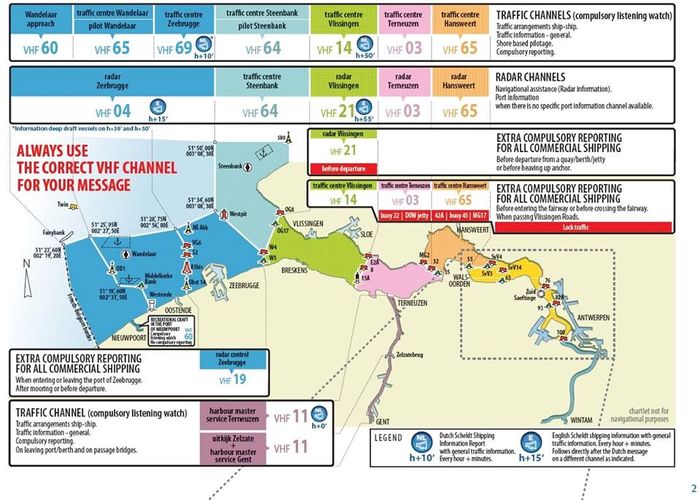 Här (bilden ovan) är kusten mellan Vlissingen fram till Oostende. Här finns en massa information med vilken VHF-kanal som gäller i vilket trafikområde. Det står att man ska ropa upp och anmäla sin ankomst till Harbour Control/Pilot i respektive hamn. Men när vi läser närmare på myndighetens websida så står det att ”om du har en fritidsbåt så har du endast krav att lyssna på kanalen IFALL du har en monterad VHF-radio ombord”. Med andra ord så är det inte ens tvunget att ha VHF, men att det är påbjudet att hela tiden lyssna av och ta del av den informationen som dyker upp på radion. De ska kunna ropa upp dig ifall det är något (ifall du har VHF).