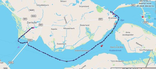 Andra dagens etapp skulle bli rätt kort, tio distans. Vi hade medström och vi behövde inte vänta allt för länge på broöppningen vid Zeeland-brug. Och strax efter bron så var det bara en liten kanal in till Zierikzee. Vi noterade att vi dykt upp i lågvatten…igen. Enligt sjökortet så skulle det vara ett djup på 2,20. Lugnt tänkte vi…och hann inte mer än tänka förrän vi stod fast i dyn. Så där stod vi i kanalen in till Zierikzee. Vi funderade över vilka alternativ vi hade. Det skulle fortsätta sjunka neråt, det återstod ännu någon timme innan strömmen och djupet skulle vara till vår fördel. Ja tänkte vi, kanske ska vi brassa lite käk och vänta in högvattnet…men vi försökte ändå först med åtgärden att backa oss ut. Men då vattnet hela tiden sjunker så sitter man för varje minut än mer fast i dyn. Vi kom inte bakåt alls. Kapten girade dikt babord mot mitten av kanalen och la på full gas på Wilma. Och nu fick den nya propellerna bekänna färg…….rörde hon sig inte lite grann framåt…?…vi tittade på varandra. Jo, sakta, sakta så vann vi lite fart över grund. Och sen så gick det lättare. Ekolodet visade återigen en 2,5 meter och vi gled långsamt med tungan rätt i munnen in i hamnen och la till.