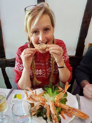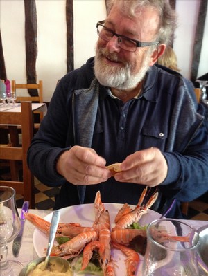 På söndagen gick vi på lokal, till en trevlig restaurang här i hamnen. Sandenmannen ville tacka oss för all hjälp han fått med sin båt, så han bjöd ut oss. Vi åt så fantastiskt gott. Skaldjur, musslor, entrecote, ostar, glass. Emellan maträtterna så blev vi serverade en iskall Calvadosglass, för matsmältningens skull. Att dra en tre-fyrarätterslunch var vi inte ensamma om här, utan det är en lunch på franskt manér.