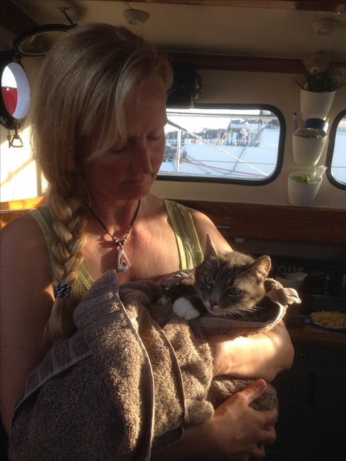 Vi slänger i jollen snabbt som satan och Tjoppe paddlar över, och får fatt i katten. Den lever. Tjoppel lossar kisse från sin snara. Vi paddlar tillbaka och tar med den ombord och den återhämtar sig så småningom. Vi tänker att någon veterinär kanske borde kolla till katten, den skakar och är chockad. Och vi tänker att kanske ägaren inte borde få ha djur i sin vård. Vi ringer lokala polisen. Han pratar ingen engelska alls. Men vi förklarar  med vissa språksvårigheter (och vi förvånas att inte polisen kan ett enda ord engelska)…till slut får vi ett par nummer till veterinären. Men bara telefonsvarare. Lördagkväll, alla har hällt upp sitt rödvin. Vi försöker till och med med några nummer till läkare på orten. Mest för att de kanske kan guida oss. Men bara telefonsvarare.