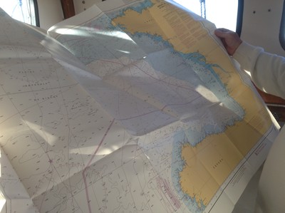 Vi gick en promenad och sen drog vi ner till hamnen till en båttillbehörsaffär. Vi köpte några saker vi hade på vår lista…dels ett sjökort, ett översiktkort, för Biscaya. Man kan ju undra vad man ska med ett överseglingskort till när det egentligen bara är en massa vatten som visas. Men det är för att kunna lägga ut positionerna vart efter vi seglar. Skulle vi tappa elektroniken ombord så har vi vår rutt noterad fortlöpande och vi vet vart vi är. Och då kan man fortsätta med ”död räkning”, vilket betyder att om man vet hur länge, hur fort och åt vilket håll man förflyttat sig från en viss punkt, så vet man också vart man befinner sig. Så det är en säkerhetsåtgärd helt enkelt.