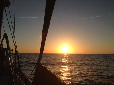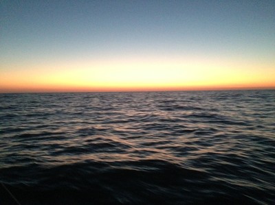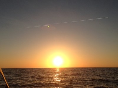 Resten av seglingen blev mycket odramatisk. För det var lite för lite vind för att segla så vi fick stötta med motor. Solen sken, vattnet glittrade och det var varmt och gott. Svallen rullade jämna och fina över havet. Vi kunde knappt tro att det var på en och samma dag vi varit med om dessa två väderfenomen. Som att resa från stekhet värme vid ekvatorn till is och kyla på nordpolen med bara några timmars mellanrum. Fast för oss, från vägghöga vågor till stilla vatten på bara någon timme. Troligtvis så hade inte tidvattnet vänt överallt där vi kom seglandes och det uppstod kraftig brottsjö där havet försökte göra upp om vilken riktning som skulle råda.