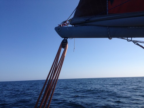 Efter någon halv distans så byggde det sig vågor från alla håll. Ingen ordning alls och Wilma tuffade för maskin. Det fanns inte riktigt något bra läge att sätta segel, hade vi gått upp mot vind så hade vi fått de värsta vågorna från sidan med de där jobbigaste krängningarna som man helst vill vara utan. Vi tyckte oss ana att havet såg lugnare ut längre ut, så vi bestämde oss för att helt enkelt jobba oss igenom vågorna och sätta segel senare.