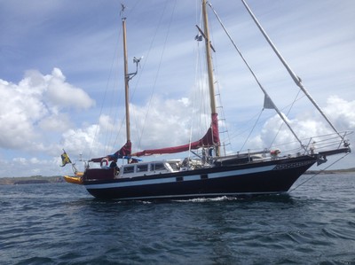 Vi har ju legat här i Camaret i flera veckor och väntat på detta trevliga tillfälle. Och idag så dök de äntligen upp. Vi mötte dem med lilljollen och vi höll en bra plats i innerhamnen till dem. Så härligt med två svenska flaggor svajandes i hamnen.