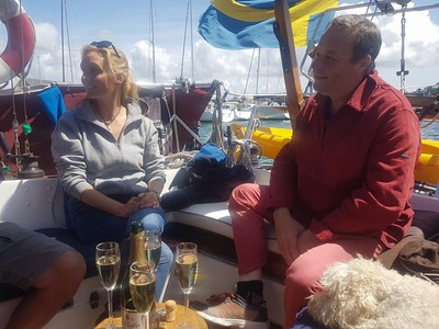 Ombord på deras skuta där vi skålade för deras ankomst och att vi äntligen fick träffas efter ett halvår av tät dialog över internet. Champagnen har vi seglat med i månader i väntan på detta tillfälle.