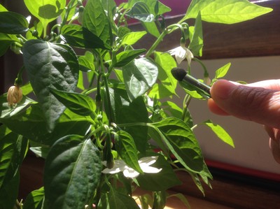 Blomster-sex ombord. Helena pollenerar sin chiliplanta för att den ska bära frukt…