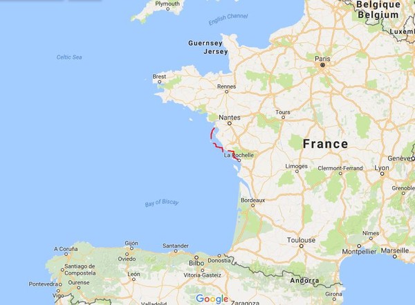 Ja ja, nog om detta. Så nu sticker vi ut på havet idag igen. Vi har ett högtryck liggande över oss nu (fast det just nu regnar faktiskt, en kort skur på en nästan klarblå himmel). Till helgen så ska det bli temperaturer på över trettio grader. Vi måste ha solhatt och skyddande kläder för att inte bränna oss, särskilt när vi seglar. Vi siktar på ön Ile d´Yeu, som ligger i det nordöstra hörnet av Biscaya. Vi har som vi räknar endast tre dagsseglingar kvar innan vi kommer att gå över Biscaya. Något vi ser fram emot.