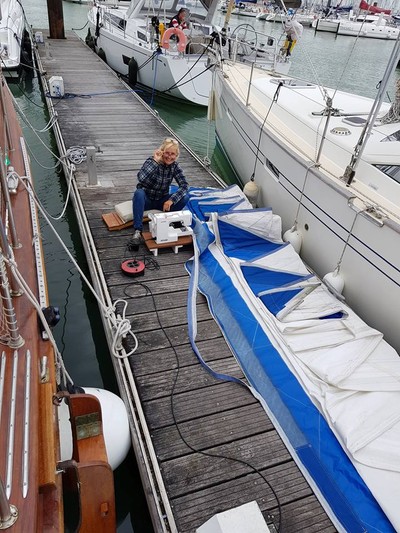 Här längs med vår kaj så ligger det mestadels finbåtar, många katamaraner i 15-20 miljonersklassen. Så när Helena satt och sydde så stannade det två fina damer och frågade om de fick fotografera henne. De tyckte syandet på bryggan såg härligt bohemiskt ut, som en tvättäkta vagabond som lagar och fixar allt själv. För ägarna till finbåtarna har för vana att lämna över sin nyckel till serviceföretagen på orten. Och varje morgon kommer det städpatruller och annan personal, inte sällan iförda vita måndräkter, för att serva rikefolkens flytetyg. De notorna är nog inte roliga att betala. Och så tråkigt sen. Vad skulle vi göra om det kom en städpatrull ombord på Wilma varje morgon??? Skulle Helena då sitta och måla tånaglarna? Och sen då, när detta var klart….? Nä gudbevars, tacka vet vi diesellukt och lite skit under naglarna. Och tänk er kapten, som även går under namnet ”kalsong” (ja han gillar att drälla runt i sina kallingar dygnets första vakna timmar). Kan ni tänka er honom stå i givakt i rosa Lacostetröja och vita långbyxor på morgonen för att ett gäng mångubbar ska komma ombord och göra hans skitjobb? Vilken syn.