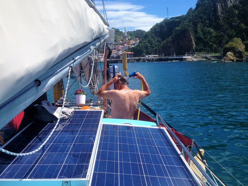 Vi stannade en dag extra i Cudillero, vi fick en solig dag och njöt av utflykt och bad från båten. Kapten duschar efter sitt dopp i det salta vattnet.
