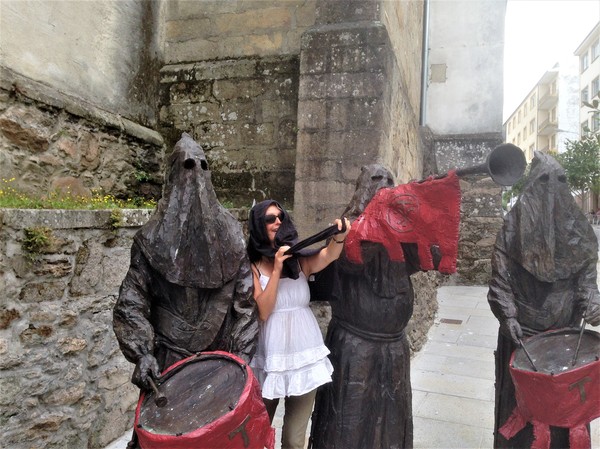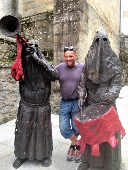 Ja som texten ovan beskriver den situation som vi befann oss i för en timme sedan, så ger detta seglarliv stundtals mersmak. Med fantastiska solnedgångar och det fria gungandet i en vacker ankarvik. Vi kan inget annat göra än att tacka oss själva ödmjukt för vårt livsval att uppleva och upptäcka vår omvärld från Wilmas köl. Vi har haft en stilla och lugn dag med lång sovmorgon. En härlig fikastund i våra danska vänners sittbrunn med prat om båtar och livet. Och efter det en välgörande promenad i Viveiros ädre kvarter. Vi stannade till vid ett konstverk. Det var inte de tre vise männen även om antalet stämde. Inte heller ku klux klan, även om tanken slog oss. Nä detta var något annat. Men det fanns ingen skylt att läsa och ingen information att finna. Så innan vi åkte tillbaka till Wilma så gjorde vi de stela männen lite sällskap för en sekund. De fotograferades i sina stela poser. Därefter traskade vi glatt ner till jollen i hamnen och åkte tillbaka mot vår ankarvik. För att få soppatorsk halvvägs så vi fick paddla sista biten i motström. Men solen var skön och motion önskvärt. Vi plockade upp jollen på däck och förberedde för avfärd. Och som avslutning så la vi oss i sängarna till ljudet av en sommarpratare tills kvällssolen fick oss att titta ut. Vi önskar att vi kunde dela med oss av känslan. Men kanske att ni kan förnimma lite av vad vi ser, upplever och känner. I morgon far vi iväg på nytt äventyr västerut. Vi vet aldrig vad som väntar. Men säkert något gott.