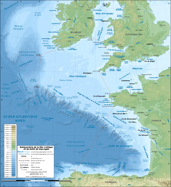Maxdjupet i bukten är 4974 meter. Och det är just skillnaden som uppstår i havsdjupet mellan de kontinentala plattorna Armorikanska shelfen och Akvitanska shelfen som ligger bakom de stormiga vatten som området är känt för.