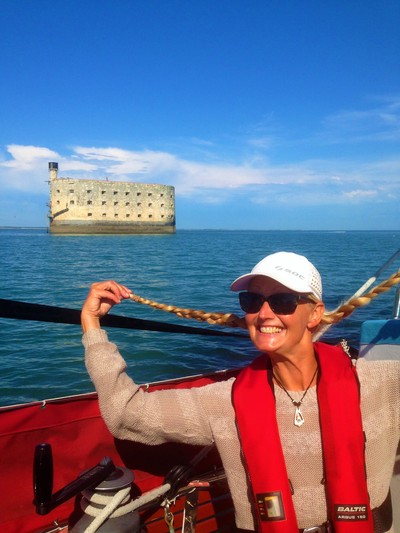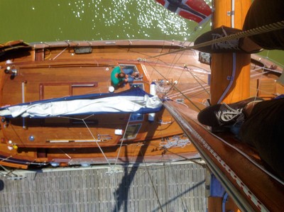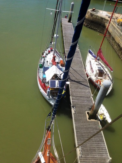 Vi ligger nu och väntar in rätt tillfälle att lämna Frankrike för den långa överfarten och den spanska nordkusten. Vi utför lite småjobb på våra två båtar. Igår var Helena uppe i norrmannens mast igen, och vi byggde om Lazy Jacks-snörena. Nu går de genom en trissa så vår vän kan sänka tygsidorna på Lazy Jacken för att kunna reva och låsa storseglet runt bommen. Tidigare så var snörena fasta i masttoppen och gick inte att sänka.