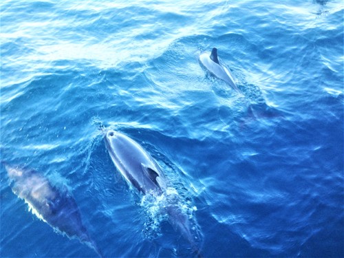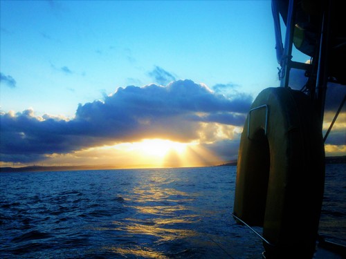 Vi lämnade Camariñas klockan 7 på morgonen tillsammans med vår gode norrman. Och utanför bukten så fick vi genast sällskap av delfiner. En vacker soluppgång och ett snällt hav utan höga svall. Vi kunde stänga av motorn och segla i fina 4-5 knop. Härligt tänkte vi.