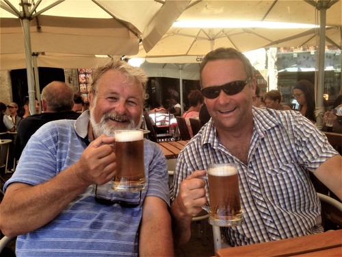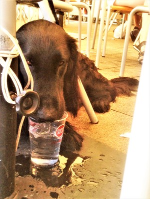 Och även vår fyrbenta vän blev serverad en drink i värmen. Vatten serverad ur ölmugg. A dog with stile!