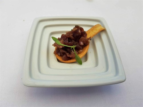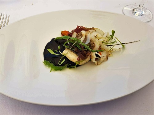 Vi åt en provsmakningsmeny som inte gick av för hackor…här serveras en blomkålssoppa med rökt lax…Mmm…