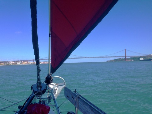 As we sailed under the Lisbon-Bridge, Ponte 25 de Abril, we celebrated with cider. To sail under the bridge is our best friend, the Constructor’s great dream. And now we happened to get here before him. So we raised the glasses and dedicated the toast to our good friend. Our friend is still renovating his boat, and he also has a mission in Asia to do before he can come after us.
