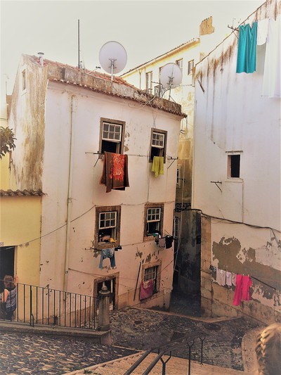 Vi la en stund senare till i en av stadshamnarna. Vi tog spårvagnen in till Lissabon centrum och promenerade runt i det vackra, gamla men slitna kvarteren i Alfama. Känslan var smått fantastisk där vi promenerade längs med de smala kullerstensgatorna. Tvättlinor med tvätt hängde överallt och däremellan dök en mysig restaurang upp med rangliga bord och stolar ute på gatan.